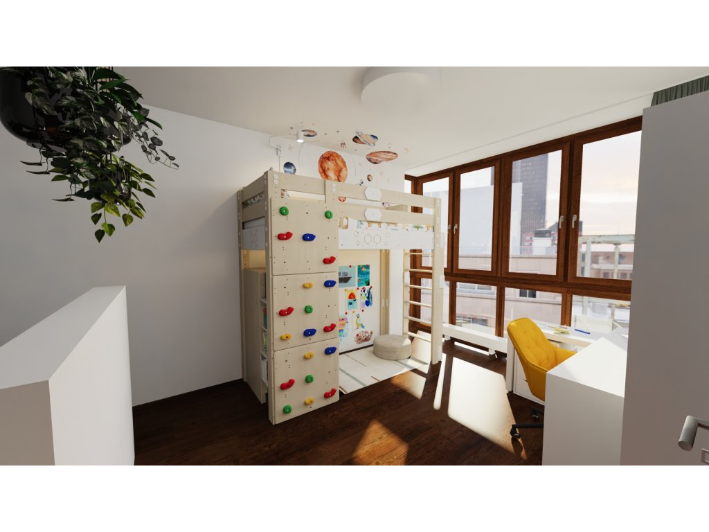Rostoucí postel MANU můžete zvednout do patra do libovolné výšky, a ušetřený prostor tak využít k dalším aktivitám. Může to být pracovní, relaxační nebo třeba herní koutek se spoustou zábavy a pohybu.