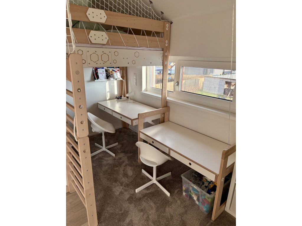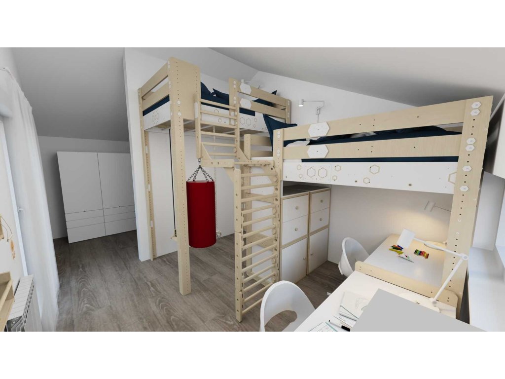 Postel zvednutá do patra s herním / pracovním koutem je efektivní řešení spací potřeby v menších prostorách a pokojících. Postel můžete zároveň kdykoliv doplnit o další lůžko nebo rozložit na samostatně stojící nízkou postel.