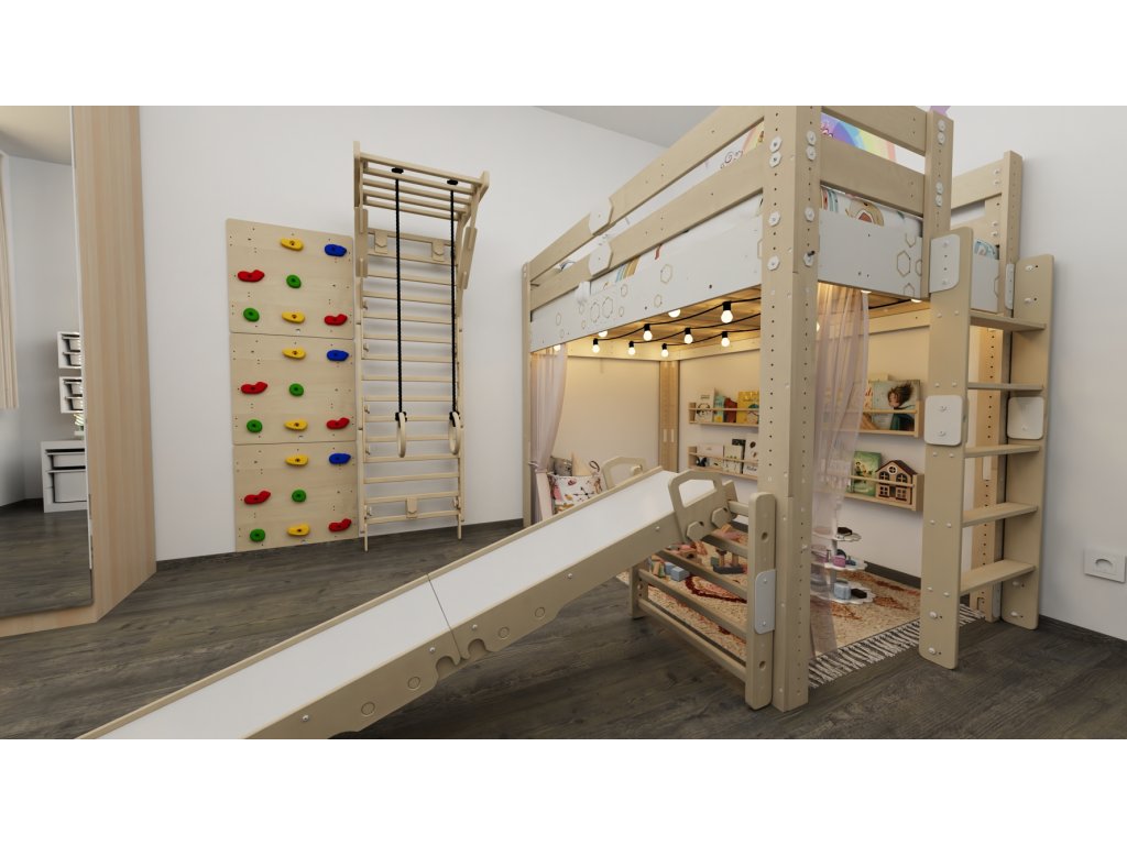 Díky chytře vymyšleným doplňkům můžete postel i případný prostor pod ní proměnit na úžasný prostor pro hraní i rozvoj pohybových schopností vašeho dítěte.