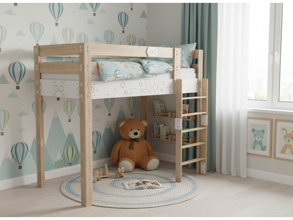 Postel zvednutá do patra s herním / pracovním koutem je efektivní řešení spací potřeby v menších prostorách a pokojících. Postel můžete zároveň kdykoliv doplnit o další lůžko nebo rozložit na samostatně stojící nízkou postel.