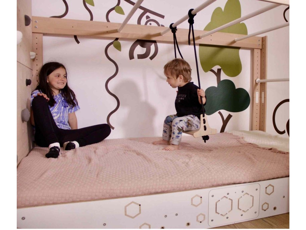 Díky variabilitě rostoucí postele MANU a její kompatibilitě s pohybovou stavebnicí FABER vytvoříte z postele bezpečný prostor pro trénink hrubé motoriky a rozvoj fyzické kondice vašich dětí, a to přímo doma v jejich pokojíku. Variant je nespočet, a záleží jen na vás, jakými doplňky postel osadíte.