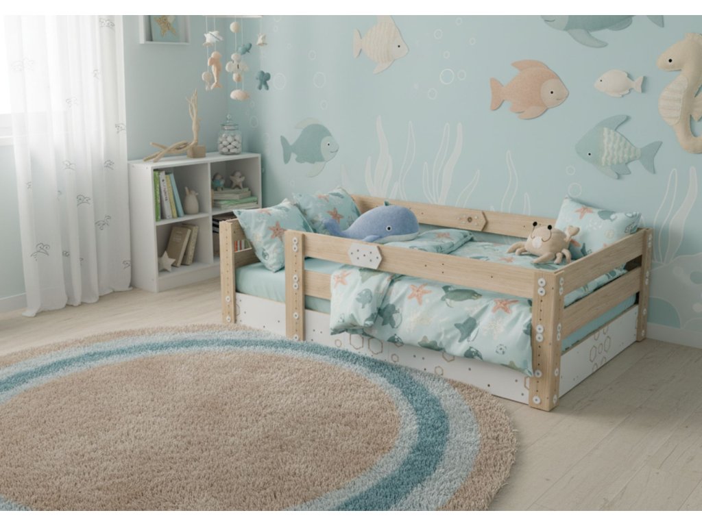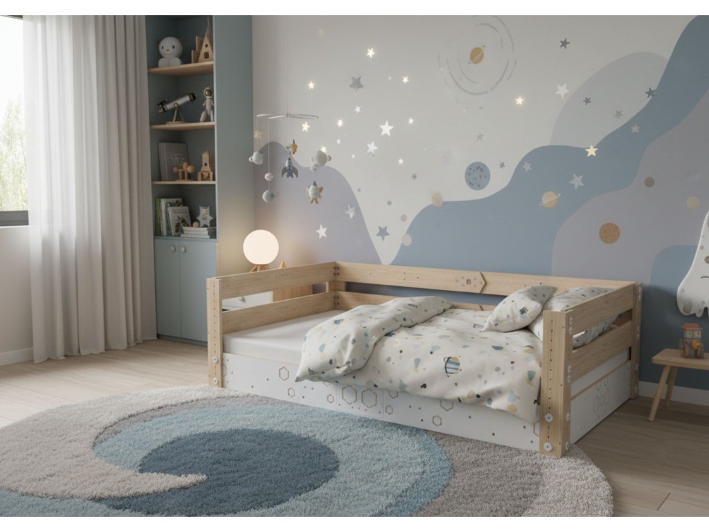 Z postele MANU vytvoříte nízkou postel na zemi, která je vhodná pro malé děti a nehrozí tak pád z výšky. Postel též můžete zvednout na rostoucích nohou do požadované výšky a doplnit ji o zábradlí. Vznikne tak prostor pod postelí, který může být vhodným místem pro skladování všech dětských pokladů.