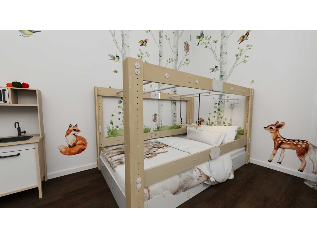 Vďaka variabilite rastúcej postele MANU a jej kompatibilite s pohybovou stavebnicou FABER vytvoríte z postele bezpečný priestor na tréning hrubej motoriky a rozvoj fyzickej kondície vašich detí, a to priamo doma v ich izbičke. Variantov je nespočetné množstvo, a záleží len na vás, akými doplnkami posteľ osadíte.