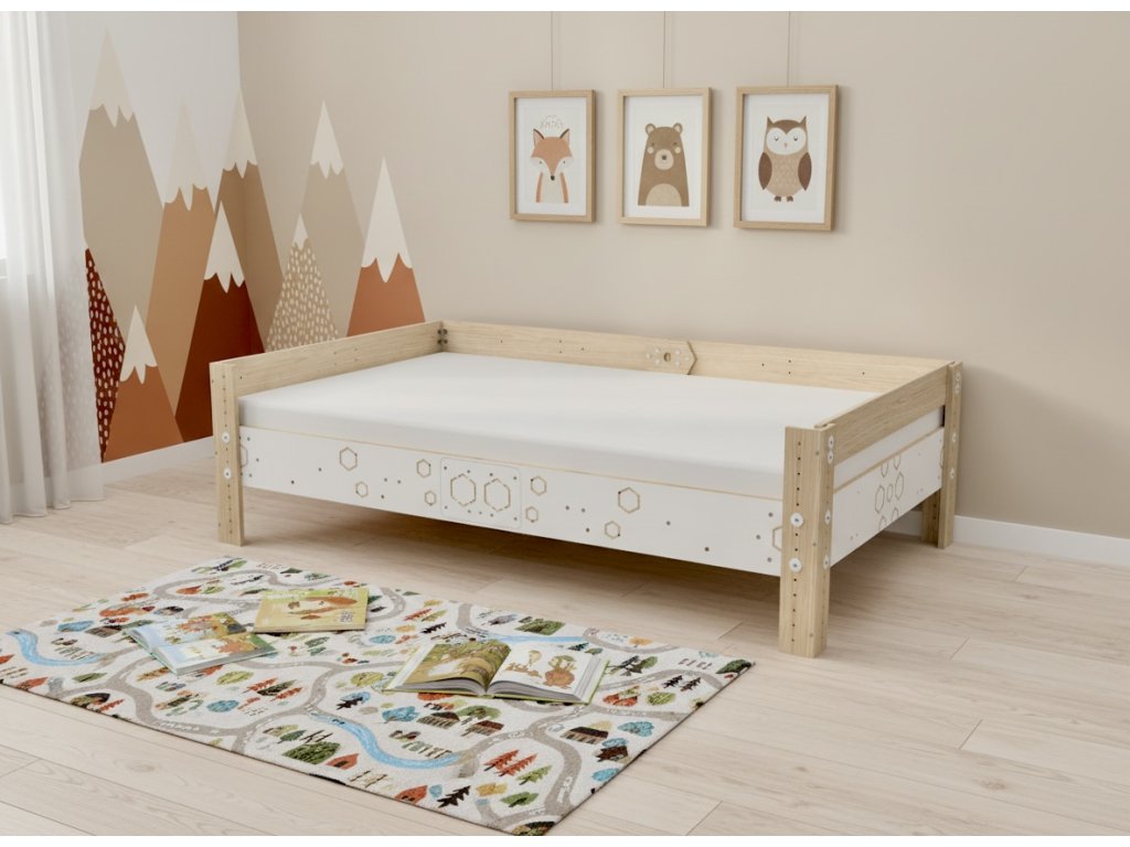 Z postele MANU vytvoríte nízku posteľ na zemi, ktorá je veľmi vhodná pre malé deti, ktorým tak nehrozí pád z výšky. Vďaka rozmeru 120 x 200 cm sa na posteli s dieťaťom pohodlne vyspí aj mamička či otecko.